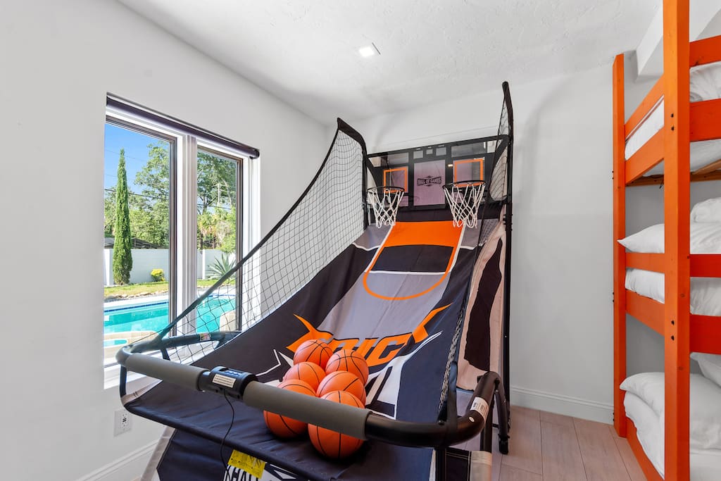 🔑 Guests enjoy full private access to the entire home and all amenities, including: • 4 bedrooms + bunk areas (sleeps up to 16) • 3 full bathrooms for group convenience • Spacious living and dining areas • Fully stocked kitchen with quartz countertops & 2 refrigerators • Indoor basketball + arcade-style games • Backyard with private pool, mini golf, BBQ grill, fire pit & lounge chairs 🚗 Parking: Free onsite parking for multiple vehicles. 🔐 Check-In: Easy self-check-in with a personalized keypad code sent before arrival.