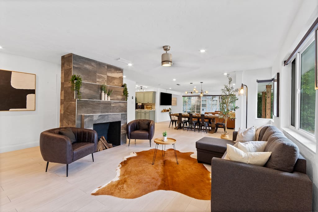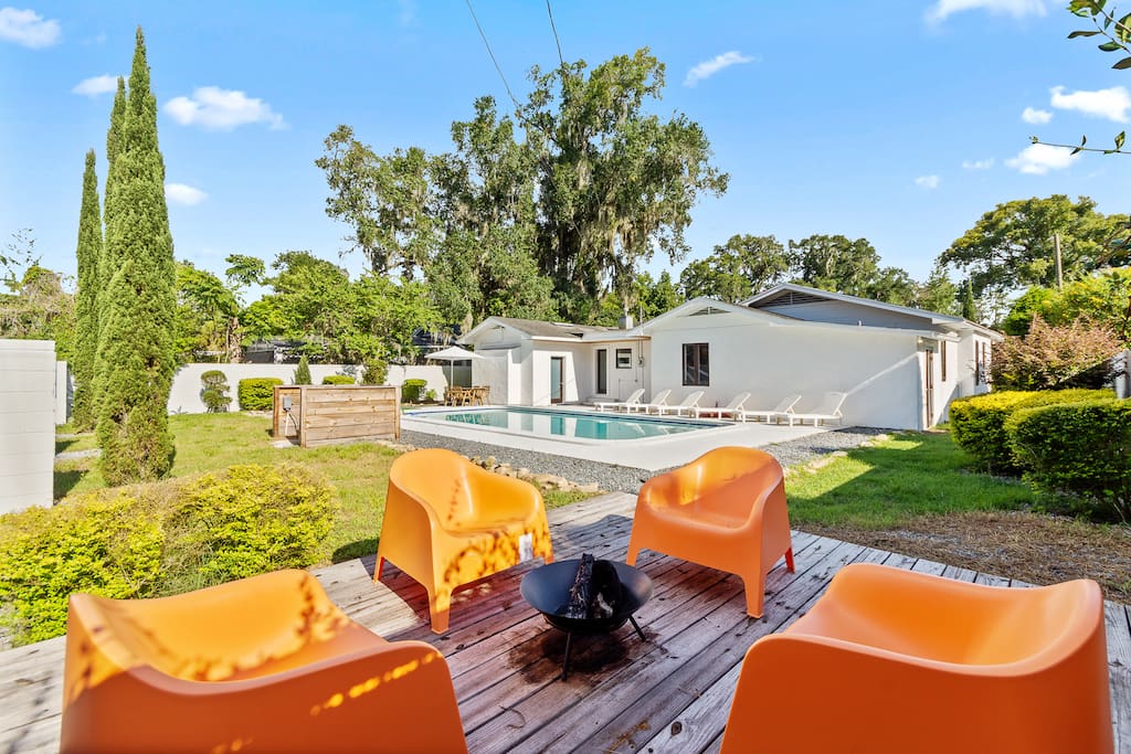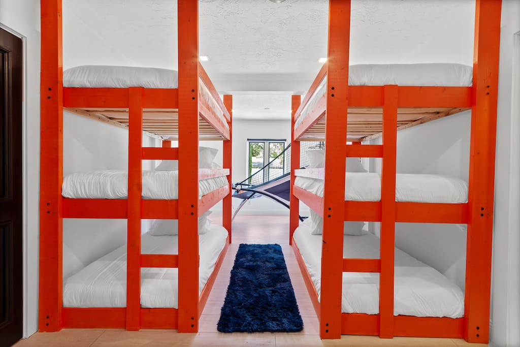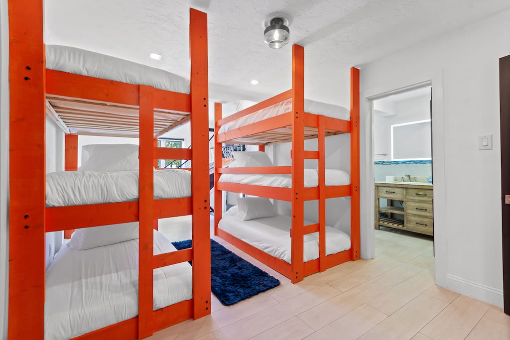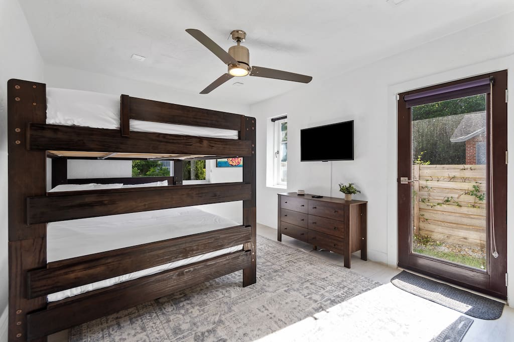 Welcome to a one-of-a-kind Gainesville getaway less than a mile from Ben Hill Griffin Stadium. Whether you’re here for a Gator game, graduation, or family trip, this home has everything you need for fun and relaxation. 🛏 Sleeping Arrangements (Sleeps 16) • Bedroom 1: King bed + Smart TV + travel crib • Bedroom 2: Two queen beds (adult-rated bunk) + Smart TV + patio access • Bedroom 3: Queen bed + Smart TV + en-suite bath + pool access • Bedroom 4: Two 3-tier twin bunk beds (sleeps 6) + indoor basketball + Arcades + en-suite bath • Living Room 2: Queen sleeper sofa 🛁 Bathrooms (3 Total) • En-suite bath in Bedroom 3 with pool access • En-suite bath in Bedroom 4 with bunk beds + indoor basketball • Third full bathroom for shared use in hallway 🍳 Chef’s Kitchen & Dining • Quartz countertops + black stainless appliances • Dining table for 8 + extra lounge seating • Premium coffee setup: Nespresso, pour-over with burr grinder, and drip maker 🎉 Indoor Entertainment • 75” Smart TV in living room • Indoor arcade basketball & cornhole 🌴 Outdoor Oasis • Private fenced backyard with new pool • Fire pit with seating for evenings under the stars • Mini golf green + BBQ grill • 6 beach loungers