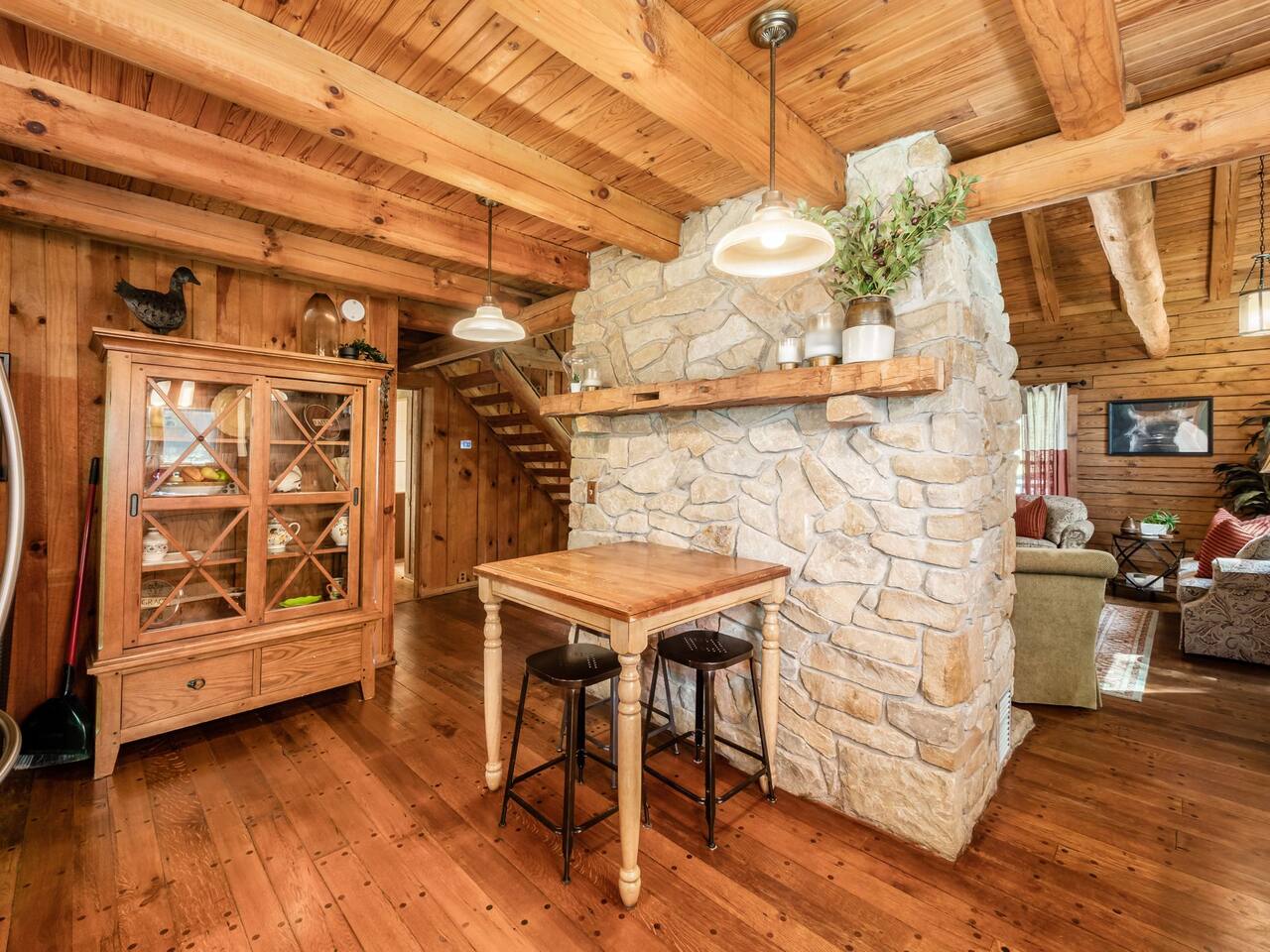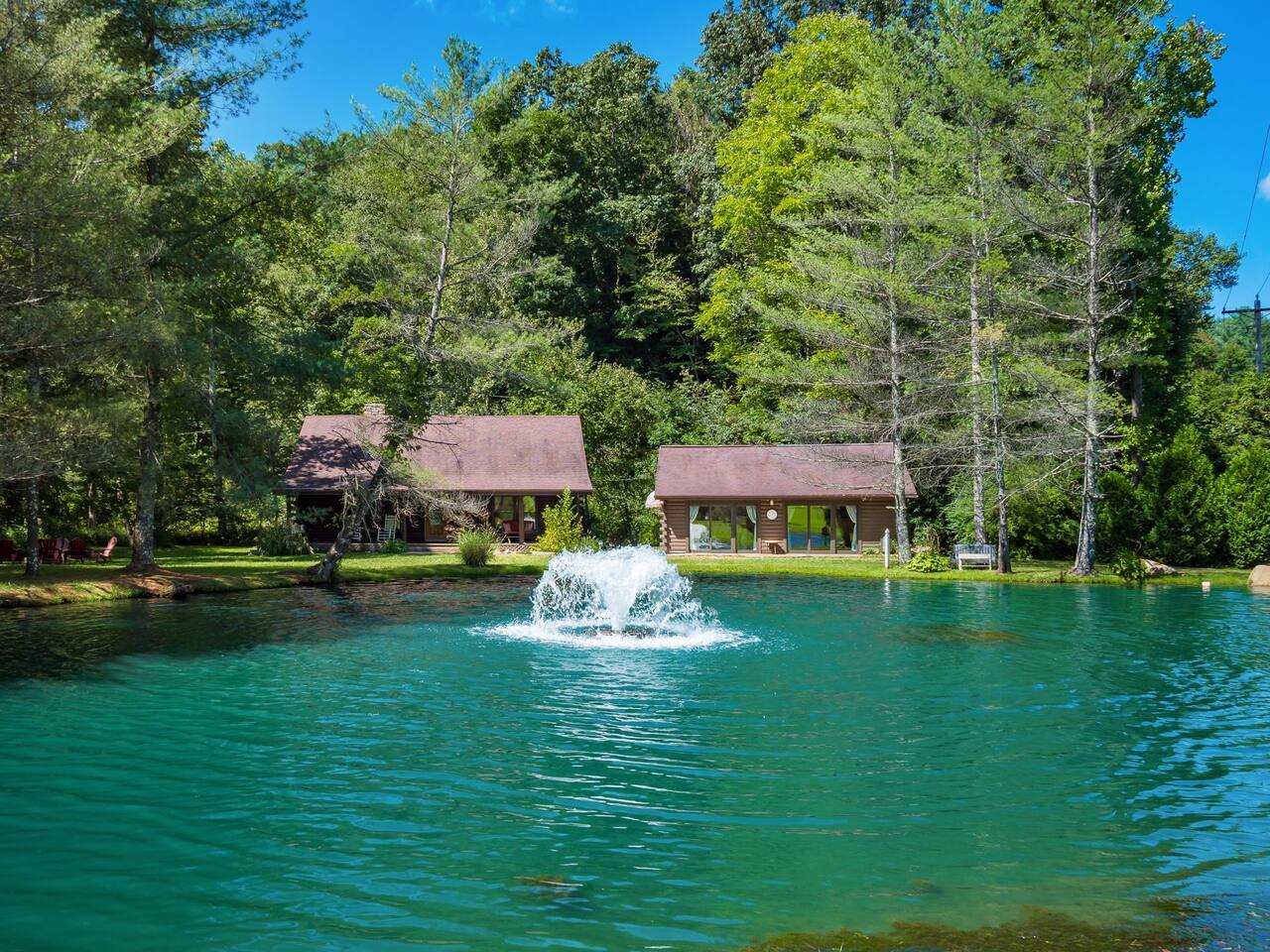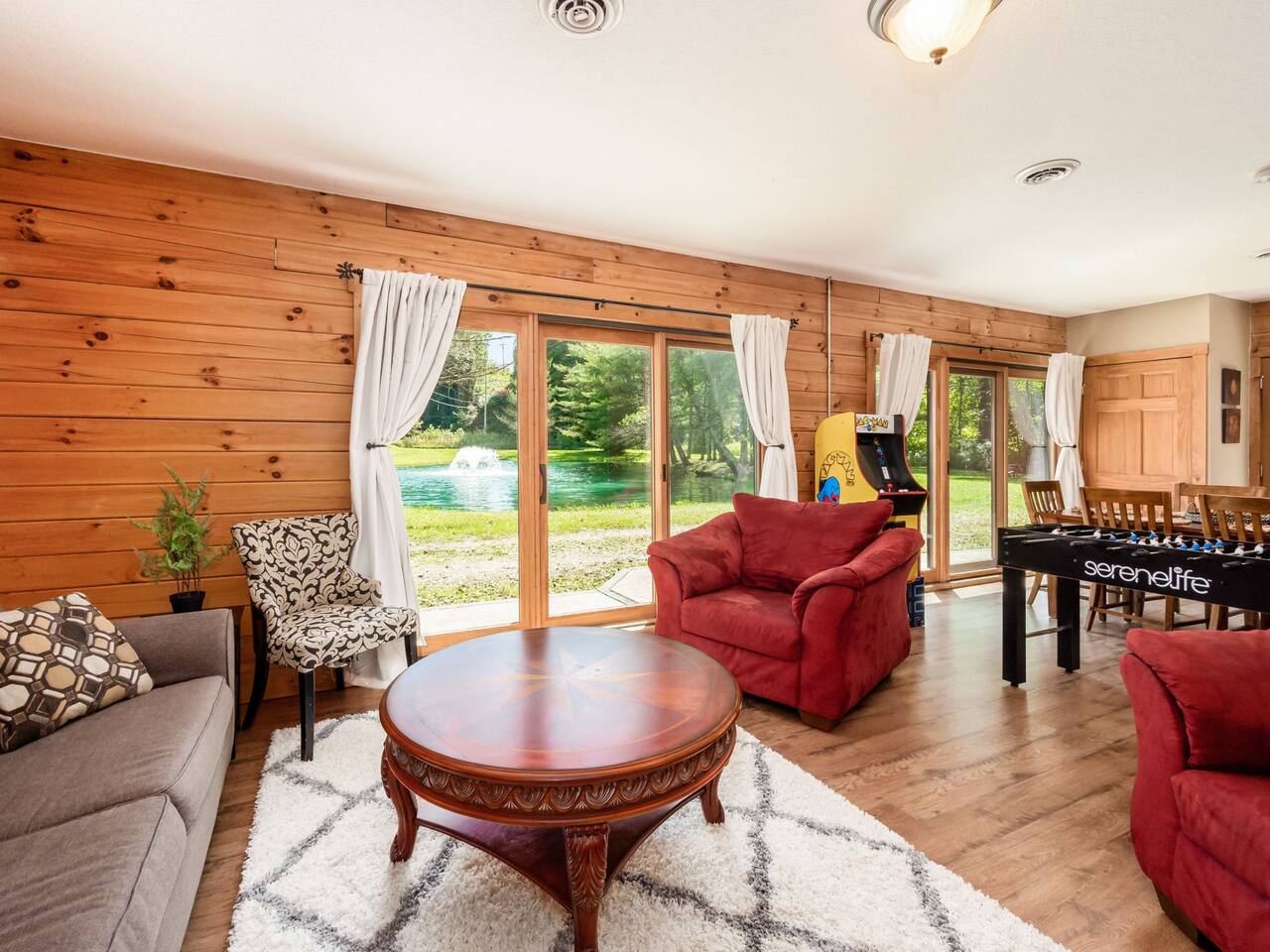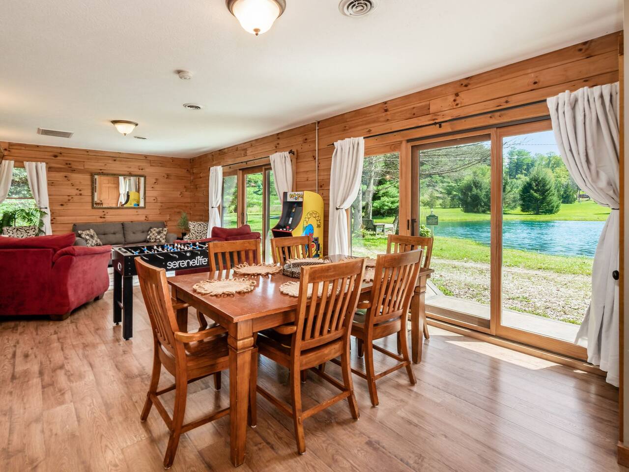 Guests have full private access to the entire property, including: • Two cabins (Main Lodge and Guest Cabin) with 4 bedrooms, 3 bathrooms, kitchens, and living areas • Three spring-fed fishing ponds with a paddle boat (catch-and-release) • Outdoor firepits, porches, and 8 acres of private woodland • 7-person hot tub located on the porch • Arcade games in the guest cabin 🚗 Parking: Plenty of private, on-site parking available for multiple vehicles. 🔐 Check-in: Easy self check-in with a secure smart lock. Your unique access code will be provided before arrival.