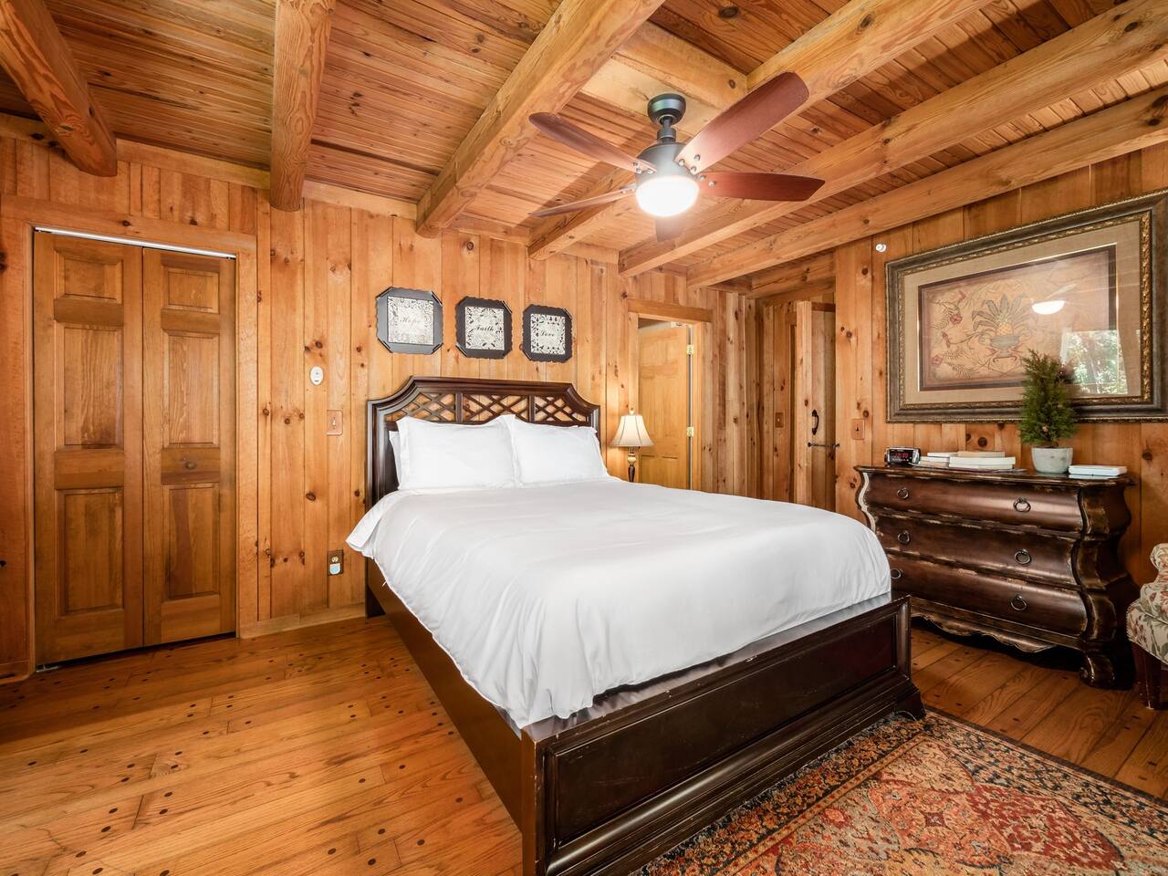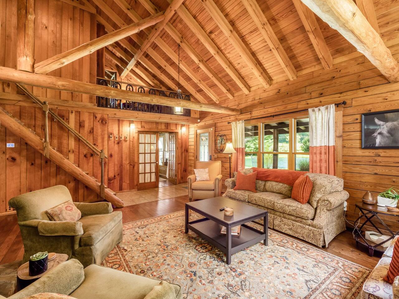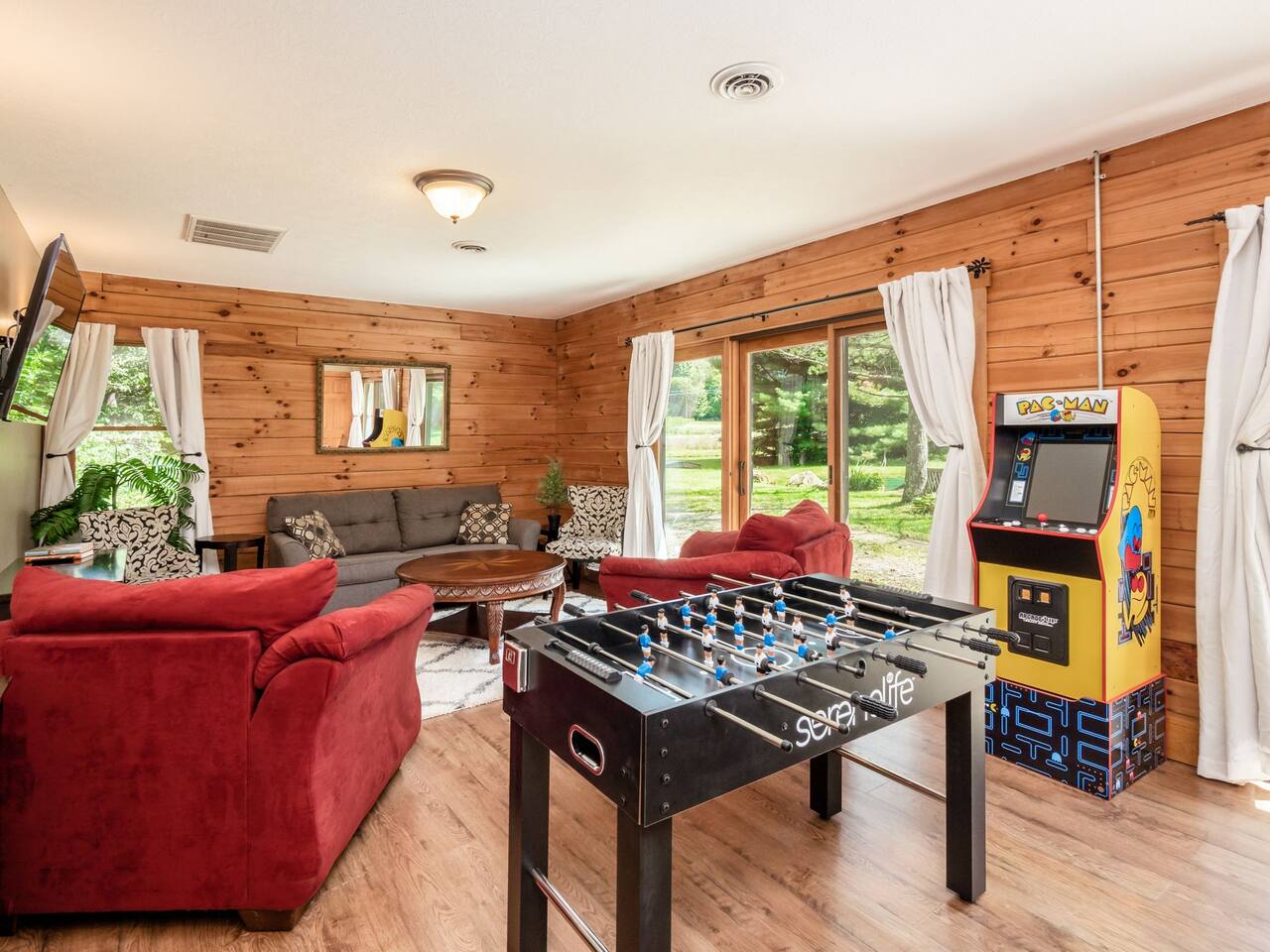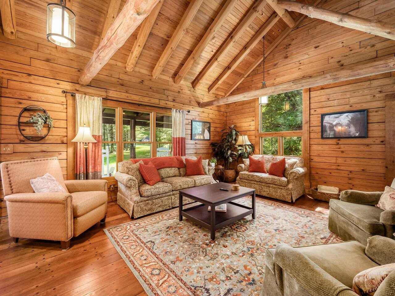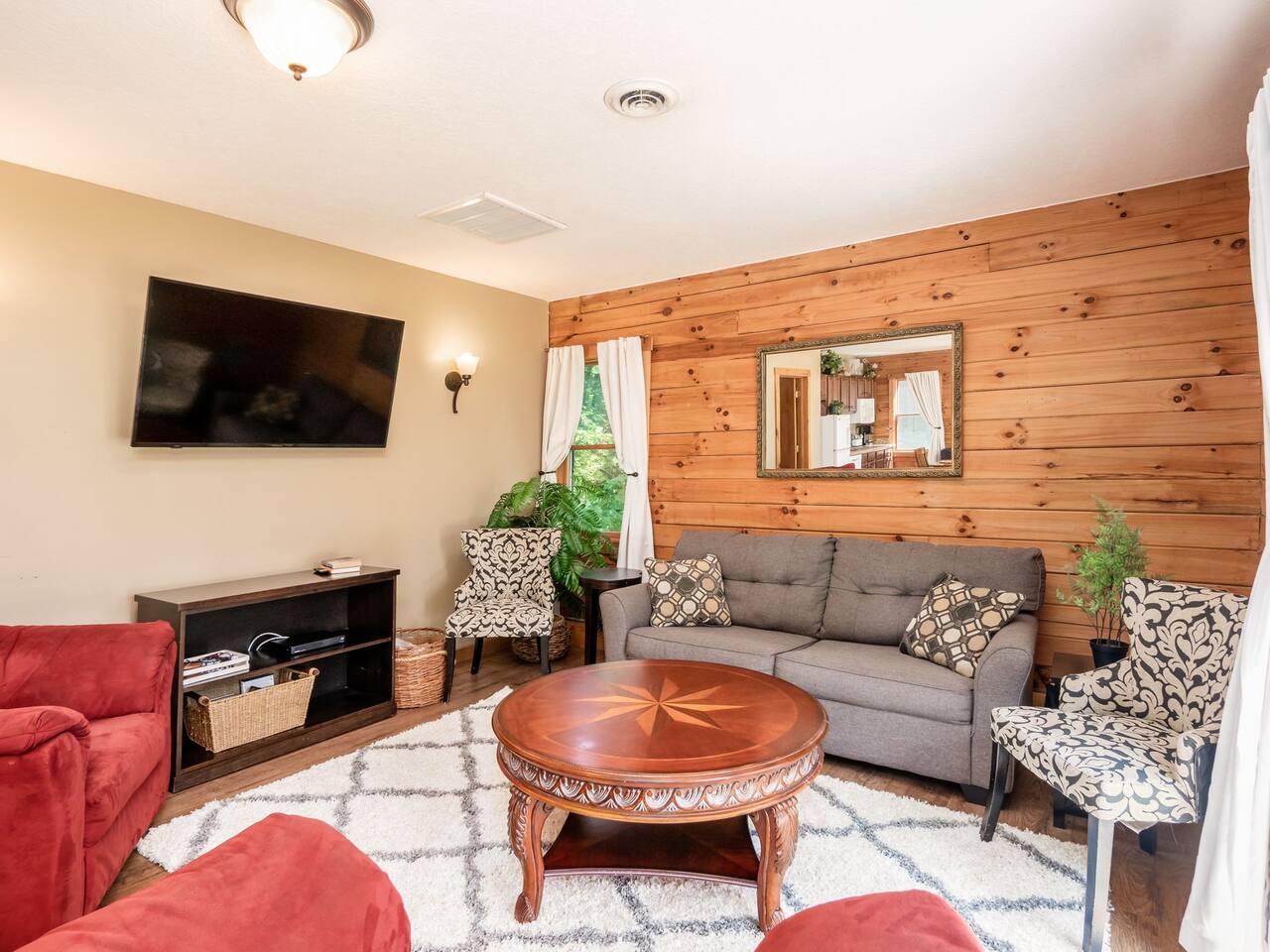 Guests have full private access to the entire property, including: • Two cabins (Main Lodge and Guest Cabin) with 4 bedrooms, 3 bathrooms, kitchens, and living areas • Three spring-fed fishing ponds with a paddle boat (catch-and-release) • Outdoor firepits, porches, and 8 acres of private woodland • 7-person hot tub located on the porch • Arcade games in the guest cabin 🚗 Parking: Plenty of private, on-site parking available for multiple vehicles. 🔐 Check-in: Easy self check-in with a secure smart lock. Your unique access code will be provided before arrival.