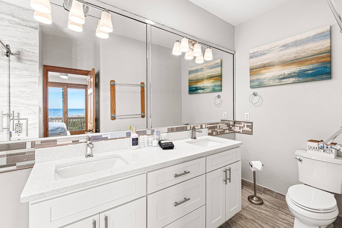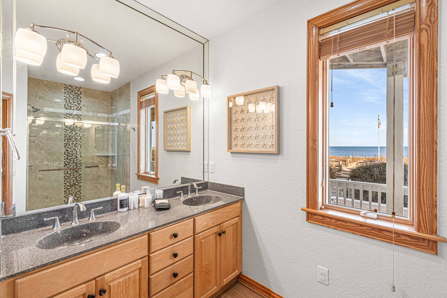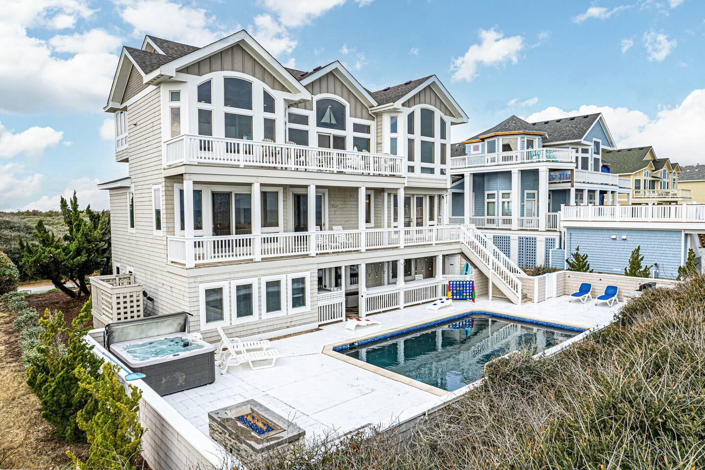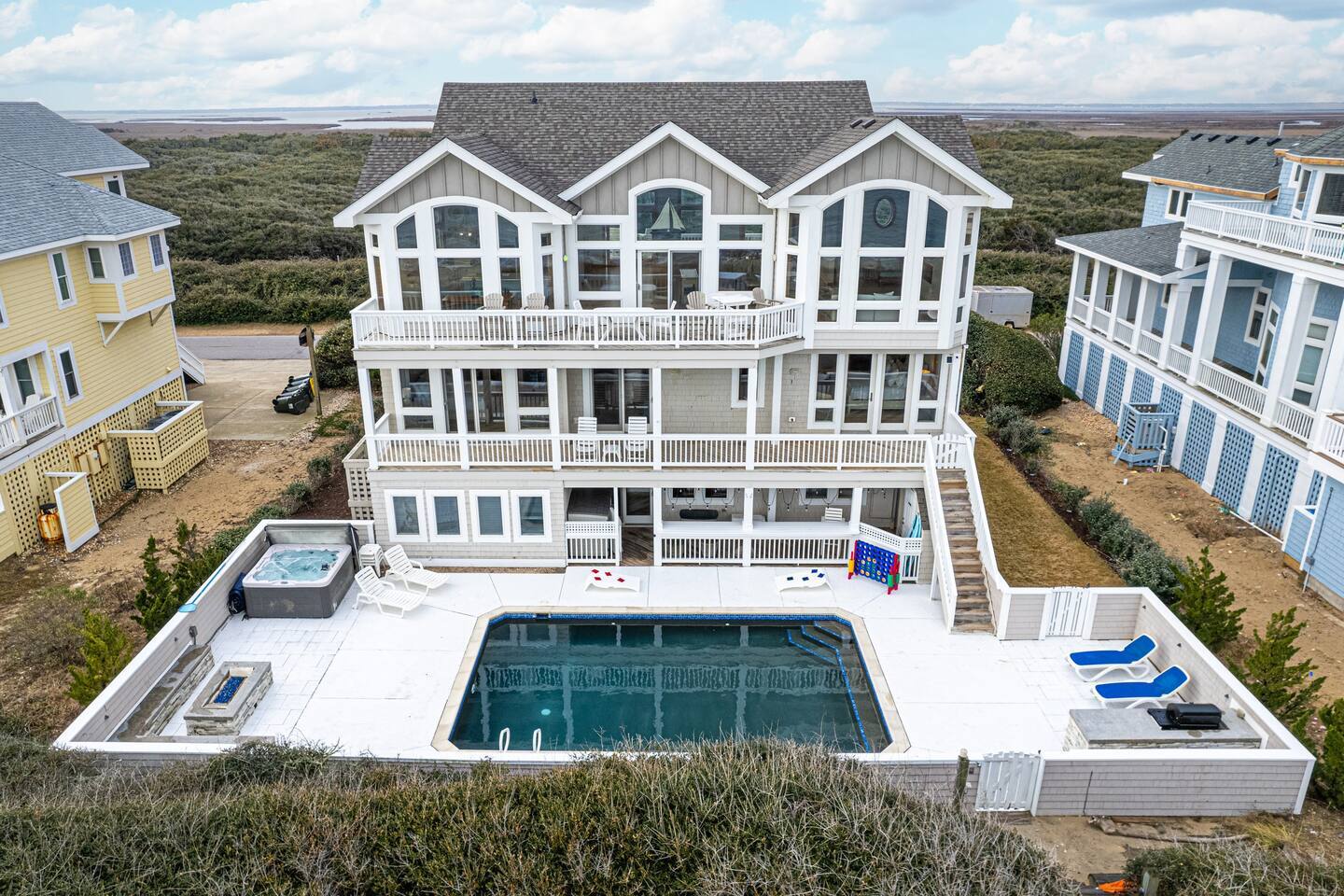 Serenity awaits at our lavish beachfront sanctuary, accommodating 16 guests. Immerse yourself in tranquility with a heated pool, blissful hot tub, and a mesmerizing fire pit. Indulge in leisure at the game room and savor moments of bliss at our curated coffee bar. With 360-degree views of the ocean and sound, every glance is a window to paradise. Your idyllic escape to the Outer Banks begins here – where relaxation meets opulence. Book now for an unrivaled coastal experience. Step into the extraordinary at our sensational oceanfront escape in South Corolla, NC just minutes from Duck! This is not just a vacation—it's an exhilarating coastal adventure for families and luxury seekers alike. "Private Heated Saltwater Pool is open from March 28 to October 24, 2025. OPTIONAL Pool Heater available for an additional fee during the following dates: March 28 – June 20, 2025: Fee June 21 – September 1, 2025: No Fee September 2 – October 24, 2025: Fee" Property Features: Private Beach Paradise: Your private boardwalk beckons you to the sandy shores, ensuring the ocean is not just a view but your personal playground! Sizzle by the Pool: Dive into the lap of luxury with your very own heated pool and decked-out oasis. Grill, chill, and create memories that sizzle! Sunrise Spectacle: Wake up to panoramic sunrise views over the ocean and bask in the glory of 360-degree ocean and sound panoramas—your party game will thank you! Game On!: Ground-level game room alert! Packed with arcade delights for all ages. Game on, laughter up, and fun unleashed! Coffee Connoisseur's Corner: Energize your days with a gourmet kitchen boasting stainless steel wonders and a coffee and tea station stocked with Peet's Coffee, Dunkin' Donuts K-cups, and a tea wonderland. The Space Details: ☆☆ BEDROOMS ☆☆ Master Bedroom 1 [MID LEVEL] - King bed / charging ports / en-suite private bathroom with new his & her vanity and sinks / shower / darkening shades / 60 inch SmartTV / fireplace / fan / Walkout to the mid deck with views of the Ocean. Bedroom 2 [MID LEVEL] - King bed / charging ports / private en-suit bathroom with shower / his & her vanity and sinks / 60 inch SmartTV / fireplace / fan / Easy walkout to second floor deck and views of the ocean Bedroom 3 [MID LEVEL] - King bed / charging ports / SmartTV / fan / private en-suit bathroom with shower / Easy walkout to walkout to porch with views of the sound Bedroom 4 [LOWER LEVEL] - King bed / charging ports / fan / SmartTV / full bathroom / Easy walkout to pool, hot tub, and private boardwalk to beach Bedroom 5 [LOWER LEVEL] - 2 full size beds / charging ports / full bathroom / Jack & Jill full bathroom / Easy access to pool, hot tub, and private boardwalk to beach Bedroom 6 [LOWER LEVEL] - 2 Twin Bunk Beds / charging ports / 32 inch SmartTV / Jack & Jill full bathroom / Easy access to pool, hot tub, and private boardwalk to beach Arcade Room [LOWER LEVEL] - stocked with arcade games, promises entertainment for guests of all ages Bathrooms: Total 4 Full Individual Bathrooms. 1 Jack and Jill bathroom on the lower level, and 1 half bathroom on the upper level - Lux selection of shampoo, conditioner, body wash and premium soap for your enjoyment and convenience. Family Room - large L sofa with epic ocean AND sound views / 70 in SmartTV with streaming services (Netflix, Disney+, PrimeVideo, HBOMax, etc) / Open room concept with tall ceilings, walk out deck facing the ocean and views of the sound. Two 8 seater dining tables, seating a total of 16 people. Stocked with fun board games for the family. Kitchen - New Pots, electric stoves, baking pans, utensils, dishware, French press, Keurig, standard teas, Kcups, frother, sugar, air fryer, blender, rice maker, waffle maker, bread makers and high chair for the little one and much more. Wrap around decks - The upper and mid level floor has a large amount of deck space, Adirondack and chairs recliners as well as the back porch with views of the sound. Laundry: NEW washers and dryers Location Highlights: This is your gateway to endless excitement in Corolla! Mini-golf, pier walks, fishing fiestas, wind surfing, and the thrill of First Flight adventure park—everything you crave is just a heartbeat away. Neighborhood Vibe: Experience the vibe —where ocean beach access, private sound front parks, and a blissful bike path along the Atlantic Ocean create a symphony of joy! Activities and Nearby Attractions: Surf the dunes, race the wind, dive into seafood wonders, and dance through vibrant festivals. Conveniently close to Elizabeth City, Norfolk/Virginia Beach, and Raleigh—the adventure is limitless! Special Features: Decked Delight: Savor the coastal breeze on your private decks—your personal front-row seat to nature's spectacle! Bike Bliss: Rent a bike for a spin along the scenic Atlantic path—because adventure is calling, and you're ready to answer! Ideal Guests: For families and luxury-loving thrill-seekers who don't just want a vacation but an annual tradition of awesomeness! Book now, and let the coastal magic of Outer Banks unfold before you. Your extraordinary escape is just a click away—seize the adventure! Private Heated Salt Pool is open from April 1 to Oct 27, 2024. OPTIONAL Pool Heat from April 1 - June 8, 2024, and Sept 2 - Oct 27, 2024, for an additional fee.